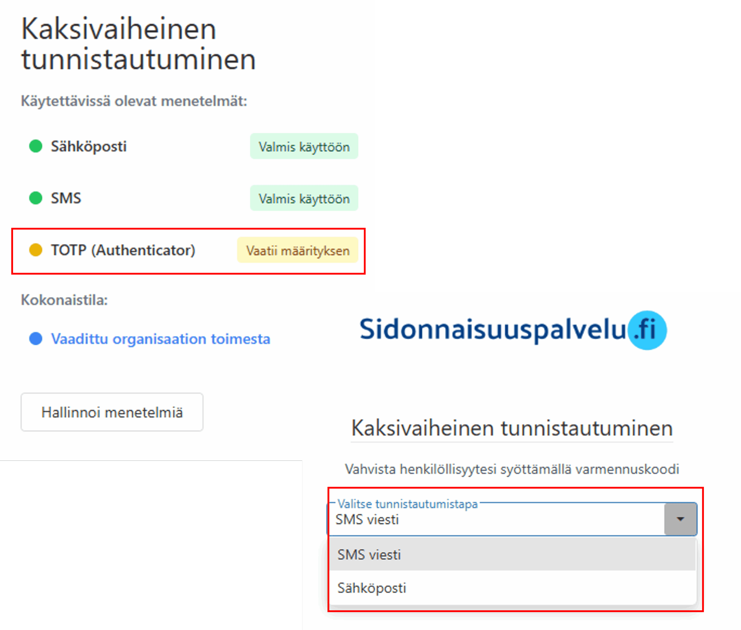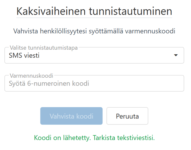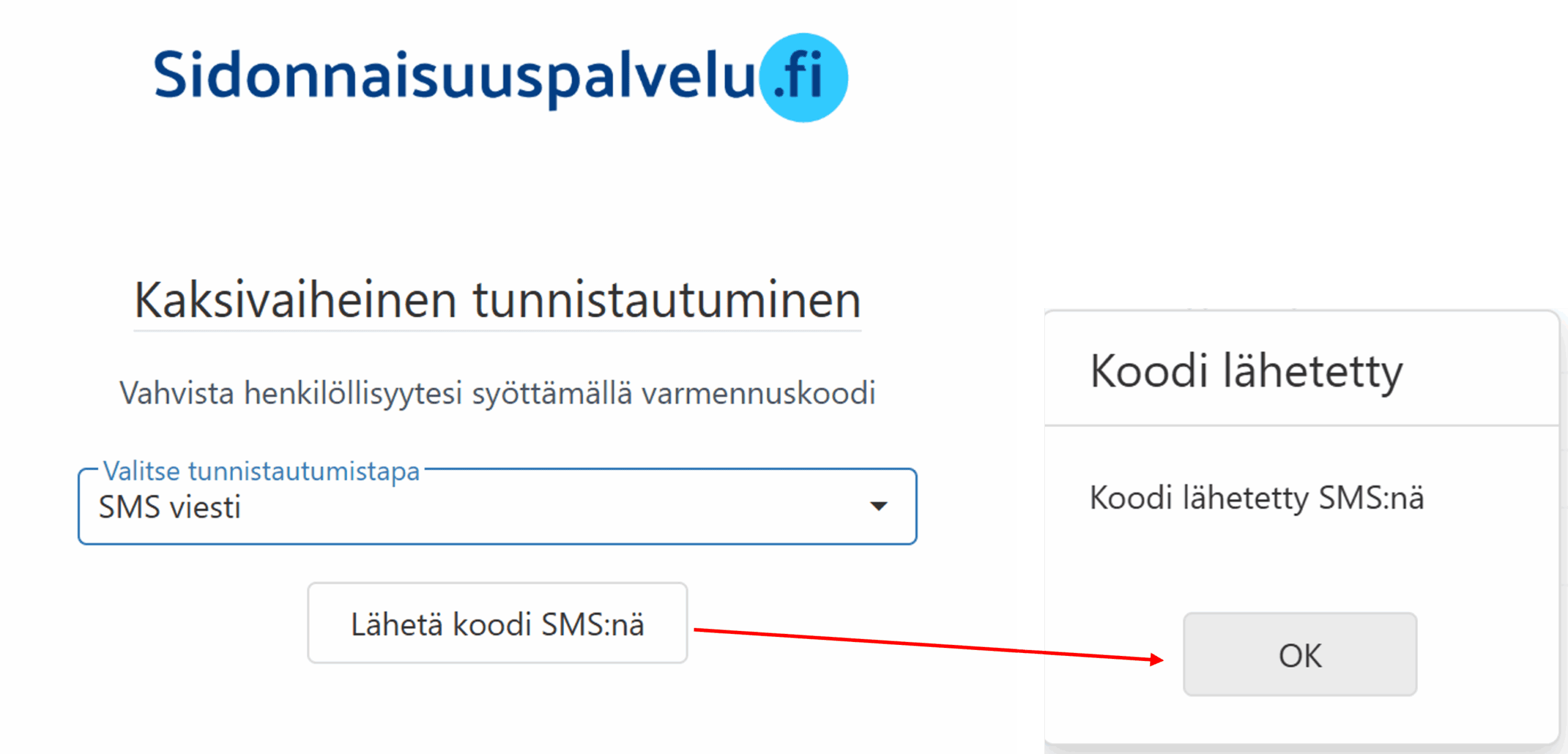 Kun haluat tunnistautua SMS-viestillä, valitse se tunnistautumistavaksi valikosta. Klikkaa ”Lähetä koodi SMS:nä”. Saat ilmoituksen, että koodi on lähetetty. Klikkaa ”OK”.