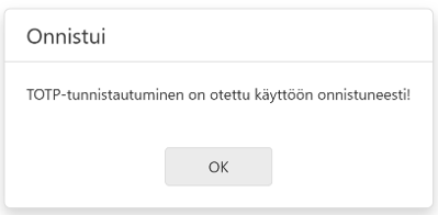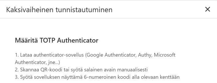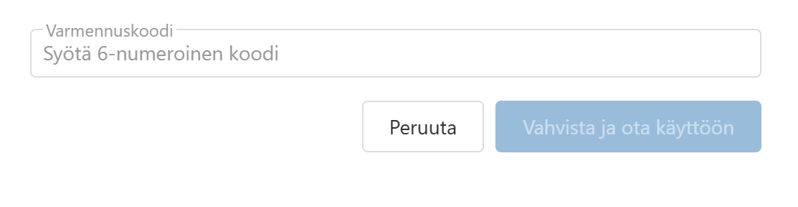 Saat ohjeistuksen autentikointisovelluksen käyttöönottamiseksi. Lataa valitsemasi sovellus ja skannaa ruudulla näkyvä qr-koodi tai syötä salainen avain sovelluksessa sille varattuun kenttään. Sovelluksen pitäisi nyt antaa 6-numeroinen koodi, jonka voit syöttää kohtaan ”Varmennuskoodi”. Klikkaa lopuksi ”Vahvista ja ota käyttöön”.