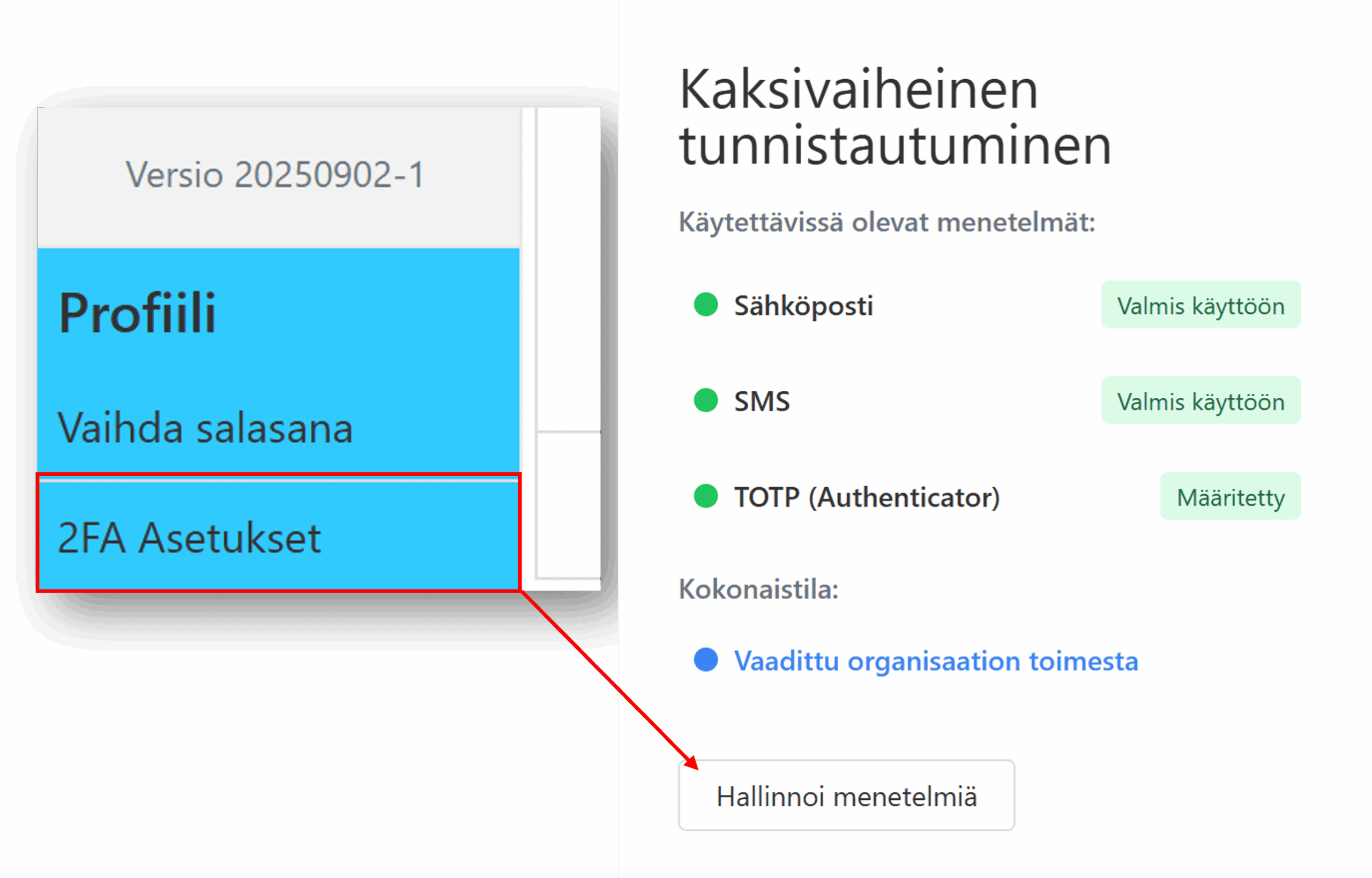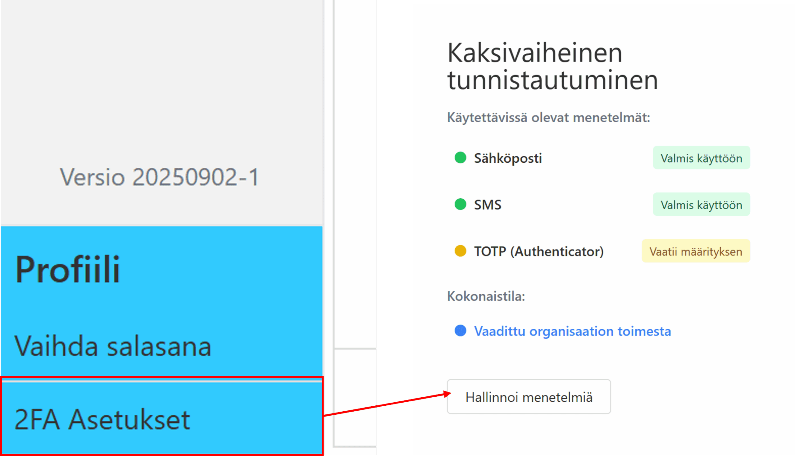 Voit tarvittaessa myös poistaa tunnistautumissovelluksen käytöstä. Mene valikon kohtaan ”Profiili” ja valitse sieltä ”2FA Asetukset”. Klikkaa ”Hallinnoi menetelmiä”.