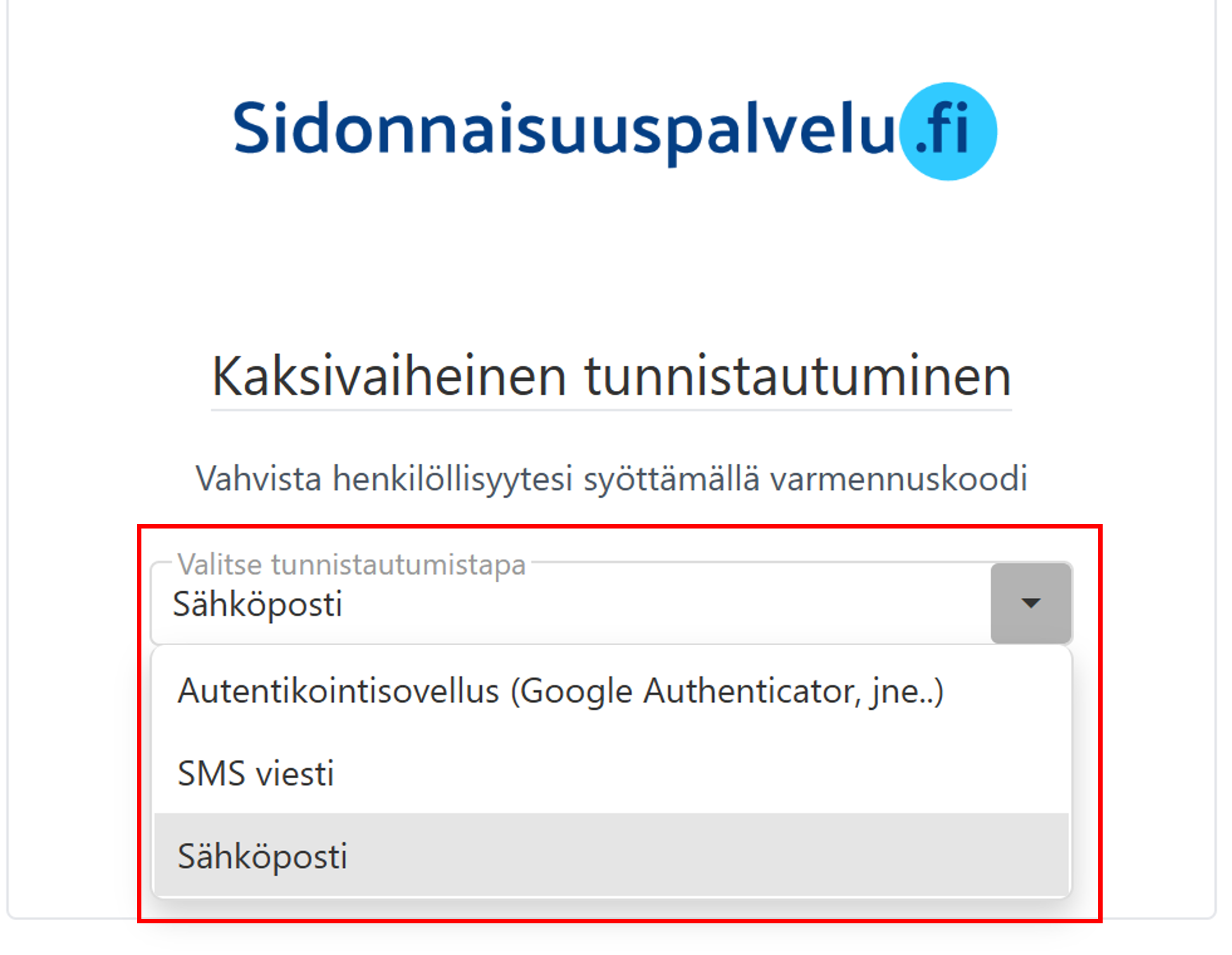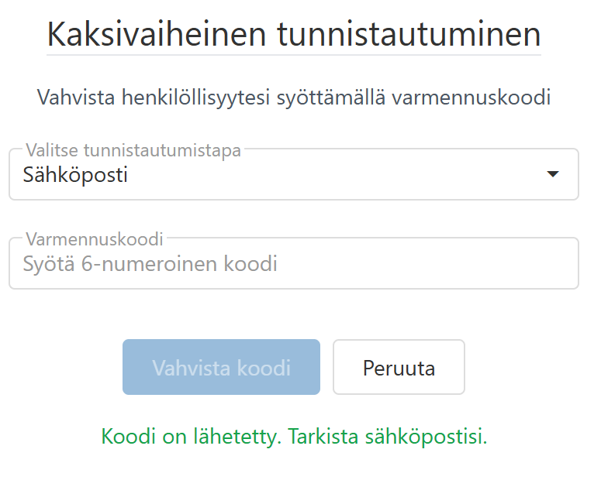 Kun haluat tunnistautua sähköpostilla, valitse se alasvetovalikosta. Klikkaa ”Lähetä koodi sähköpostilla”. Saat ilmoituksen, että koodi on lähetetty. Klikkaa ”OK”.