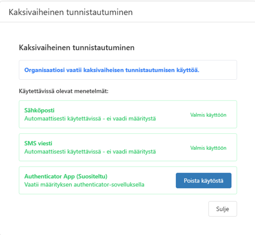 Authenticator App kohdassa klikkaa ”Poista käytöstä”.