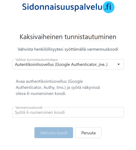 Voit nyt tunnistautua Sidonnaisuuspalveluun autentikointisovelluksella. Valitse se kirjautumissivun alasvetovalikosta ja avaa autentikointisovellus. Kirjoita sovelluksen antama 6-numeroinen koodi kohtaan ”Varmennuskoodi” ja klikkaa ”Vahvista koodi”. Pääset nyt kirjautumaan Sidonnaisuuspalveluun.