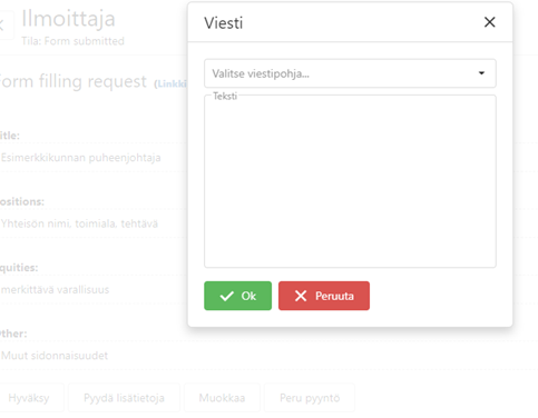 Klikkaa “Pyydä lisätietoja”. Tarkenna tietokenttään, mistä haluat lisätietoja. Vaihtoehtoisesti voit myös valita viestin valmiista viestipohjista. Klikkaa sen jälkeen “Ok”, jolloin ilmoittajalle lähtee sähköpostilla pyyntö täydentää ilmoitustaan.