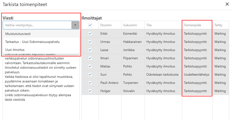 Avautuu ikkuna, jossa voit valita viestipohjan mukaan pyyntöihin ja tarkistaa tehtävät toimenpiteet.
