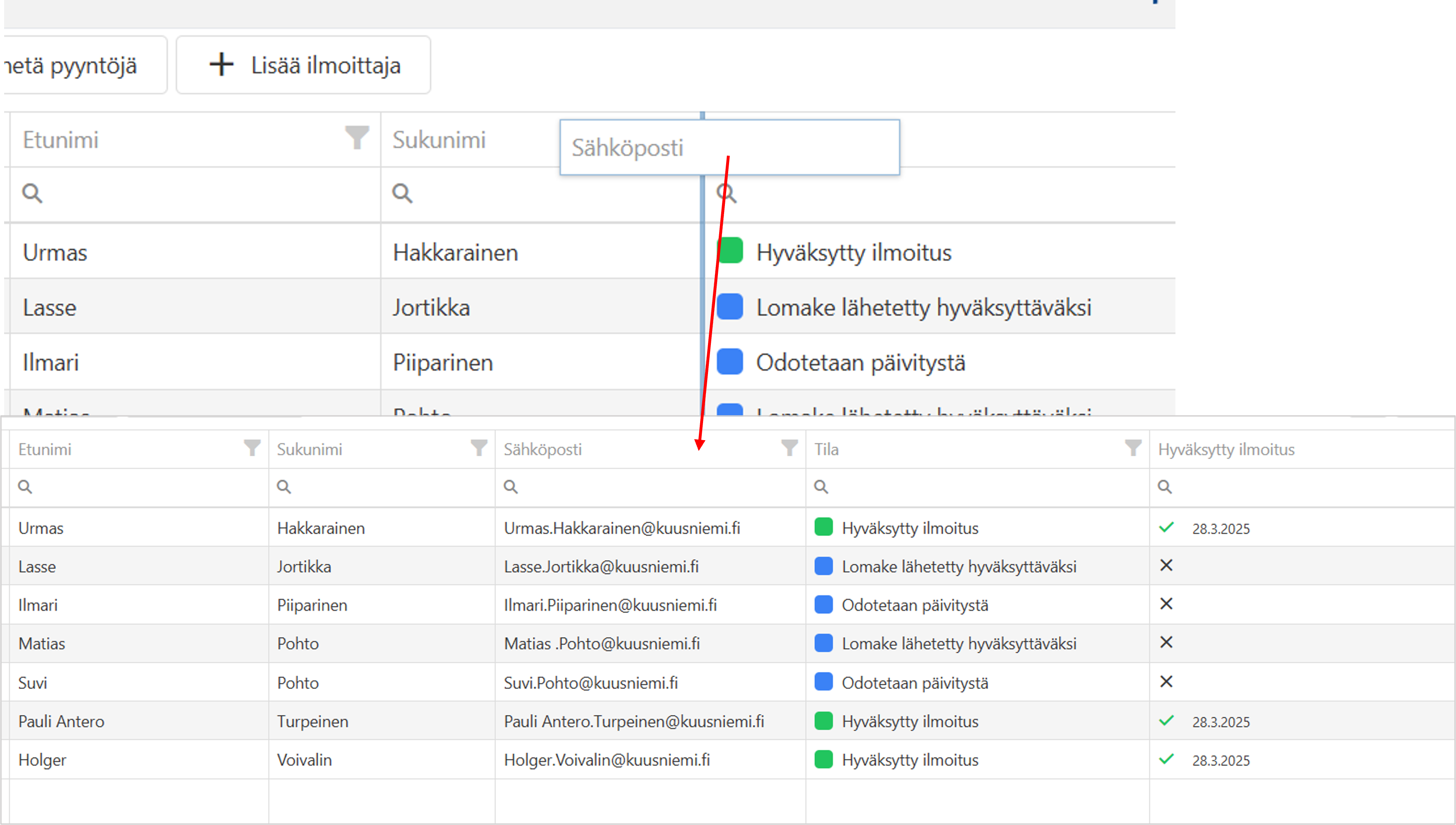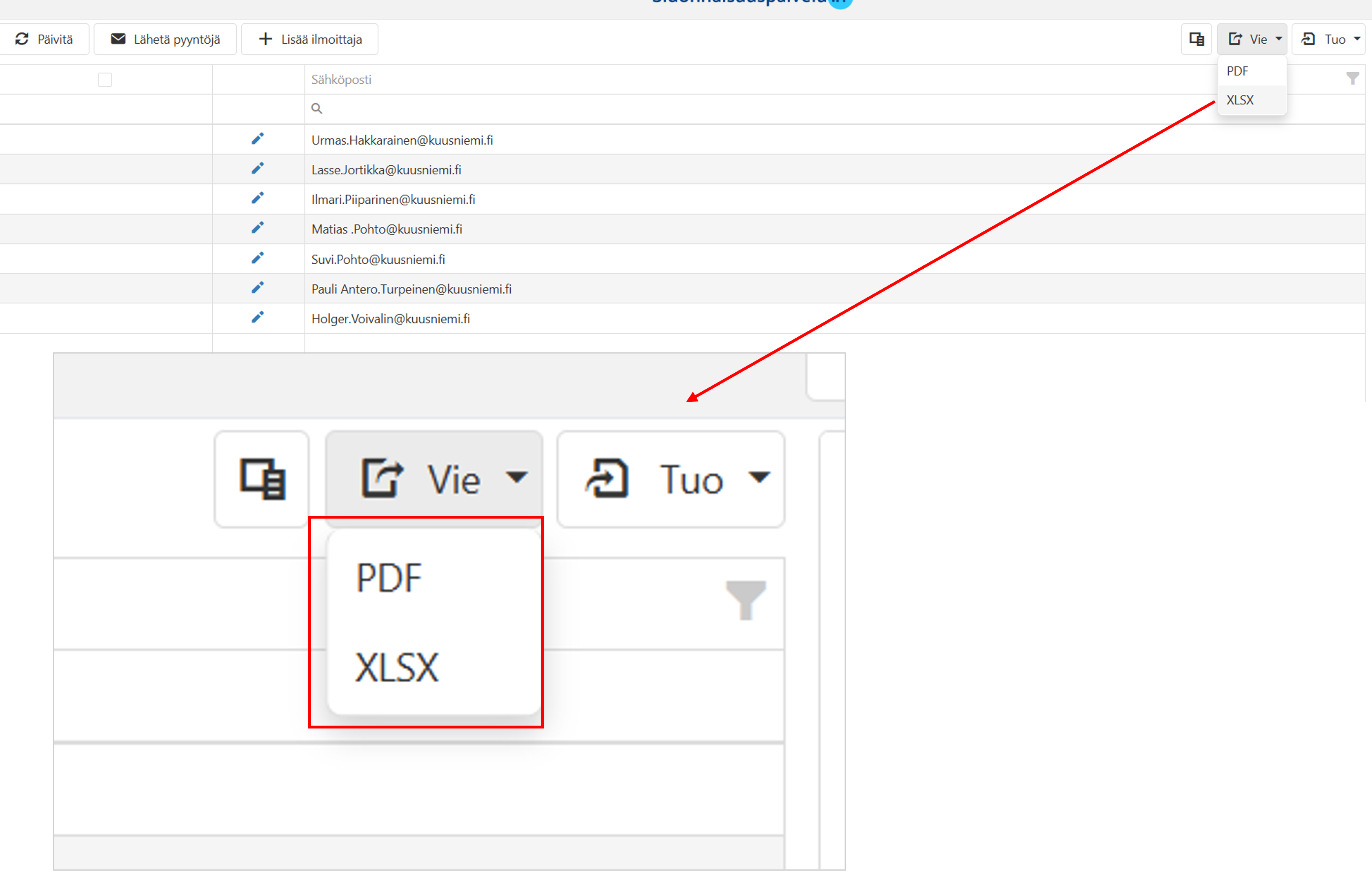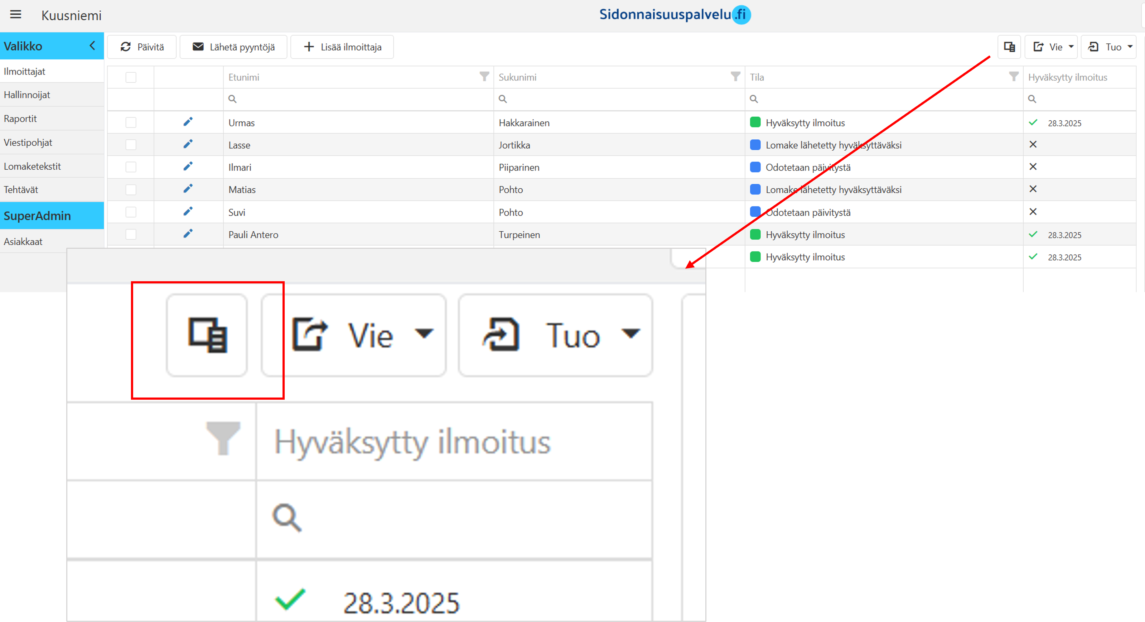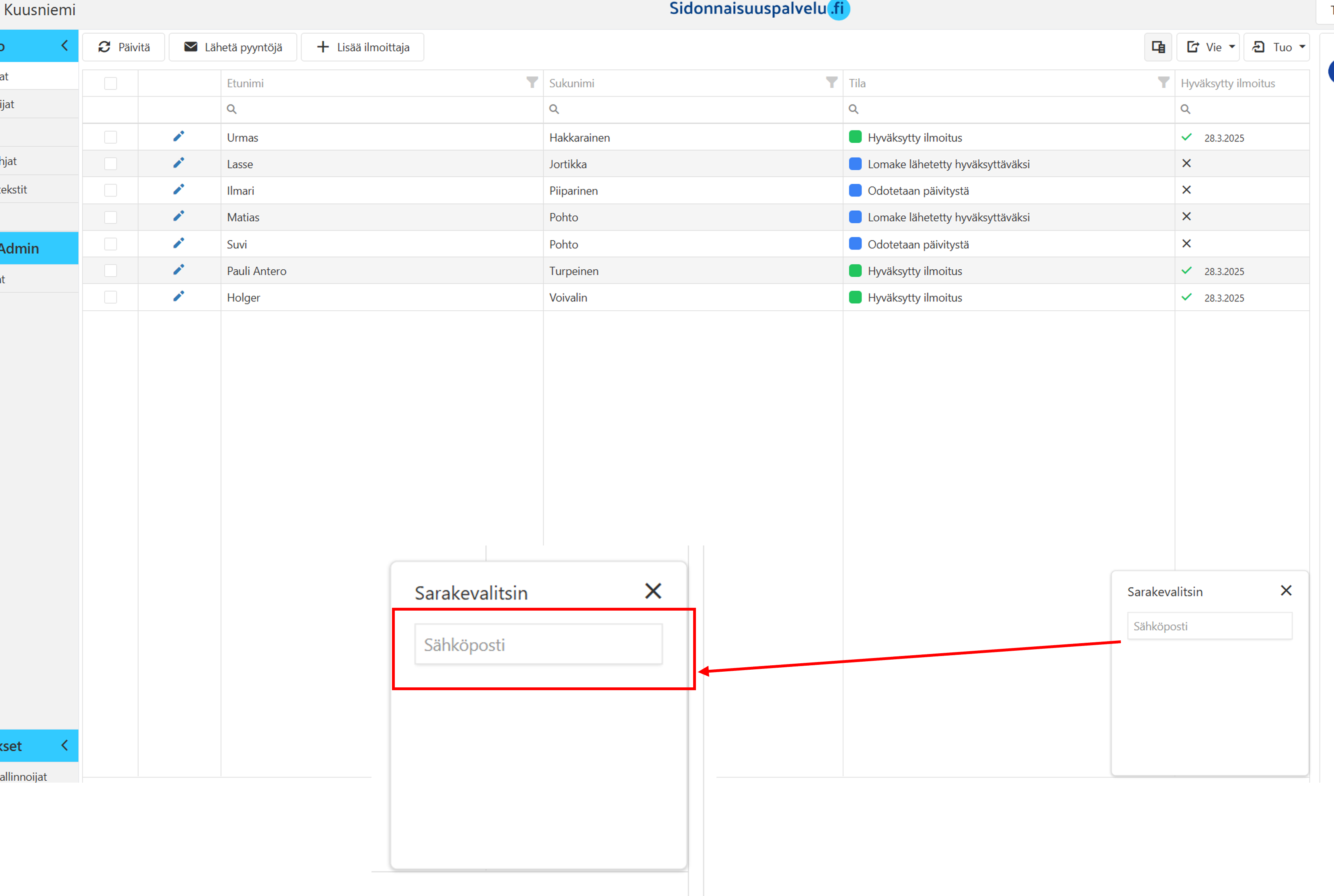 Tässä ohjeessa kerrotaan, miten käytät sarakevalitsinta ja viet ilmoittajien tietoja PDF tai XLSX-tiedostoon.